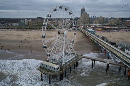 Aerial cityscape of the Ferris Wheel and the de Pier in Hague, The Netherlands. Gloomy day near the North sea with a view to the Scheveningen beach shore.