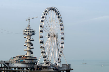 The Hague, Februari 18 2019: Scheveningen, The Hague, The Netherlands. Ferris wheel and a bungy tower on the pier of Scheveningen, The Hague. The Netherlands