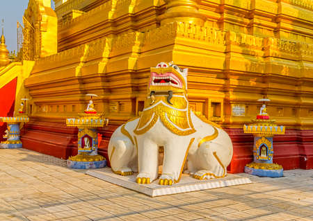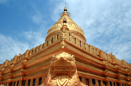The Shwezigon Pagoda or Shwezigon Paya is a Buddhist temple located in Nyaung-U, a town near Bagan, in Burma, nuilt by King Anawrahta. Golden lion detail.