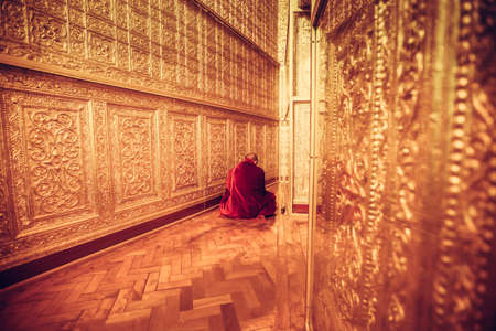 MYANMAR - FEBRUARY 9: Unidentified Monk in Red suit make meditation in big golden room at Botataung pagoda on February 09, 2014 in Yangon, Myanmar