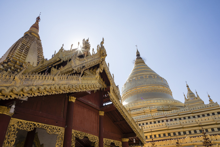 The Shwezigon Pagoda or Shwezigon Paya with sunrays is a Buddhist temple located in Nyaung-U, a town near Bagan, in Myanmar