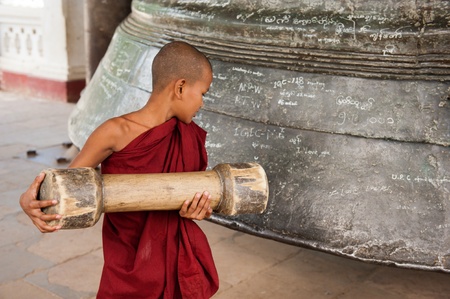 Bagan, Myanmar - February 25, 2011 : Three young monks sitting on the ground inside Shwezigon Pagoda in Bagan