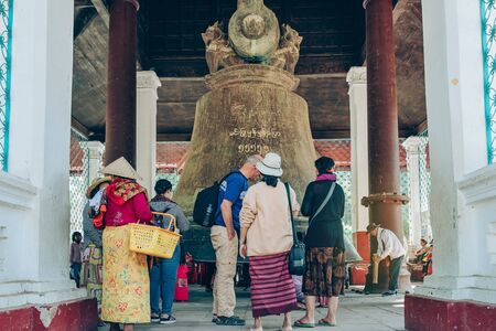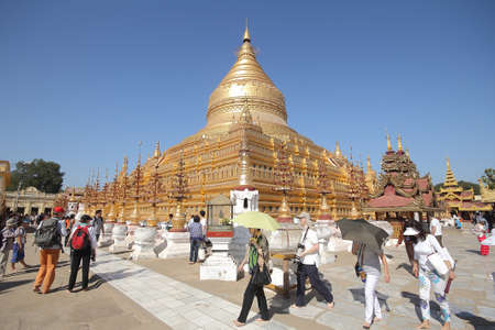 BAGAN-Myanmar, January 21, 2019 : Unidentified tourists make merit and photographing at Shwezigon Pagoda on january 21,2019 in Bagan, Myanmar.