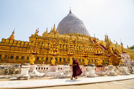 BAGAN,MYANMAR-MARCH 9:A monk walking around Shwezigon pagoda in Bagan,Myanmar on March 9,2017.Shwezigon pagoda is one of top 5 important pagoda in Myanmar.