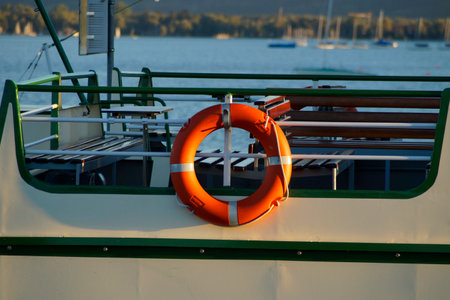 Lifebuoy on the deck of a cruise ship at sunset.