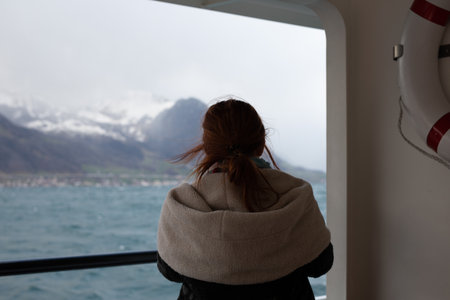 Woman Contemplating Scenic Mountain View from Ship