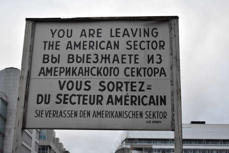 Leaving sign at Checkpoint Charlie in Russian French English and German in Berlin