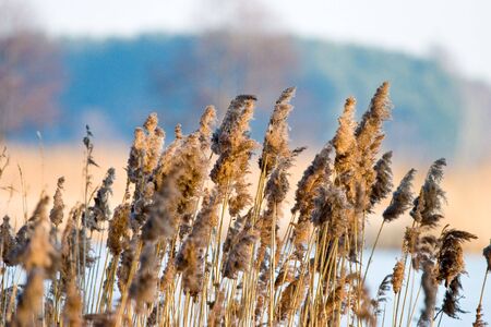 Common Reed (Phragmites australis) close to a lake in sunny autumn light against the blue sky