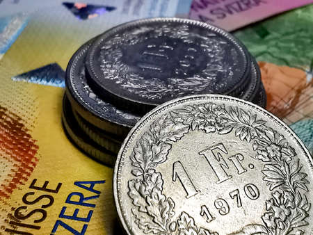 Caucasian male hand holding a bunch of Swiss francs cash banknote close up shot isolated on dark gray.