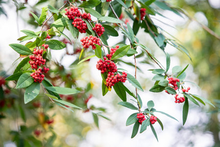 Bush with lots of red berries on branches, autumnal background. Close-up colorful autumn wild bushes with red berries and cold green leaves in the park. Shallow depth of field