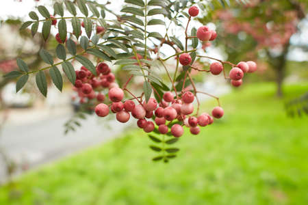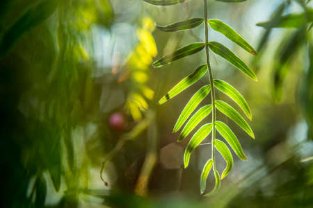 A closeup view of the bright orange ashberries with a sunlight streaming on them through the rowan leaves. Selective focus. Blurred green background