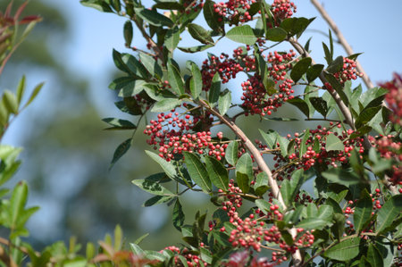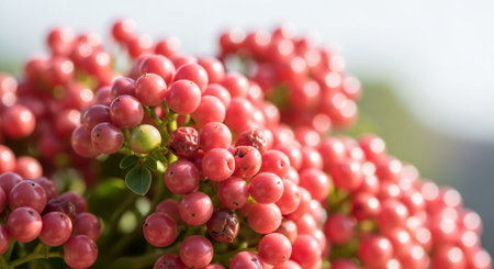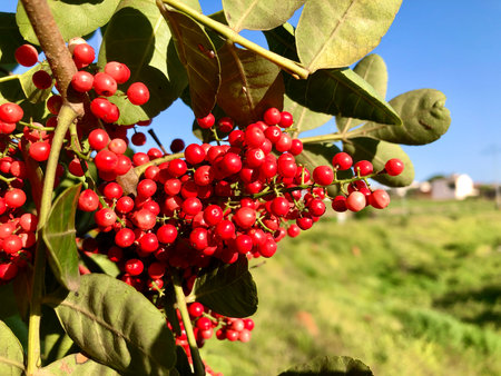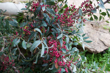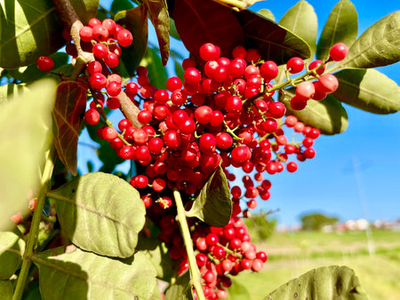 Beautiful pink peppercorns on leafy, colorful branches in full season, ready to be harvested and sent for use as culinary seasonings