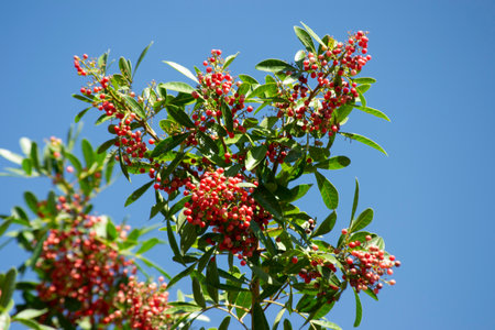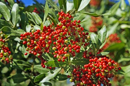 Closeup of lentisk plant branch with clusters of red fruits and green leaves