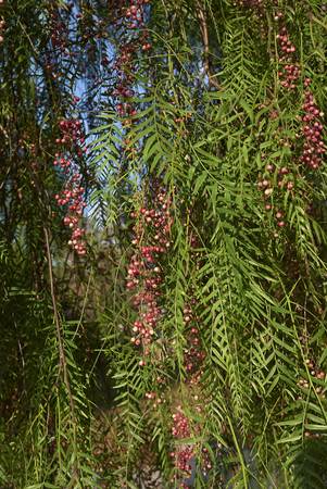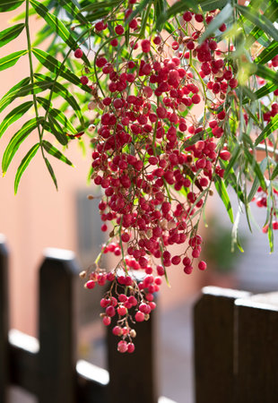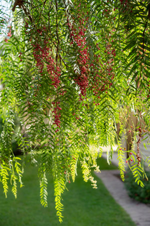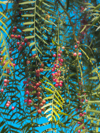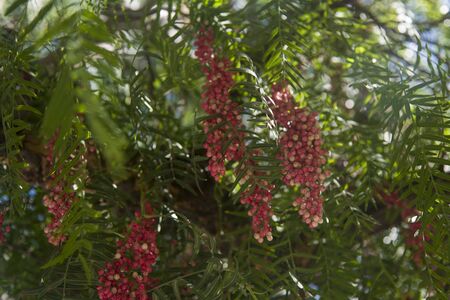 Pink peppercorn berries in the park. Schinus molle, pink pepper fruits on tree branches