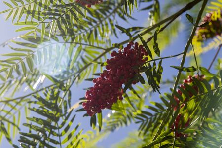 Fresh pink peppercorns on peruvian pepper tree branch. Blue sky at the background.