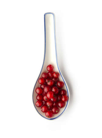 Red currants in chinese spoon isolated with clipping path. Above view.