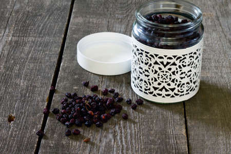 The Black wolfberries or black goji berries, on wooden background.