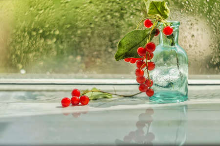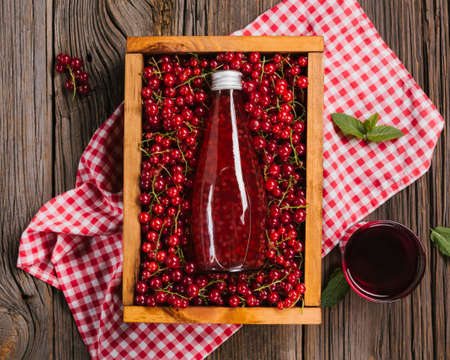 Red currant fresh fruit and beverage on a table. Moody sunset lighting