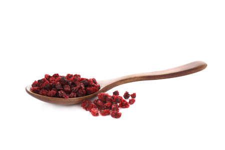 Dried red currants and wooden spoon on white background