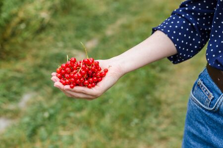 Hand holding fresh berries, Ripe red currant, juicy fruit