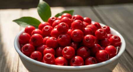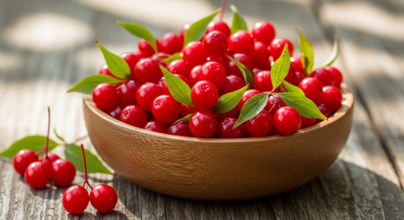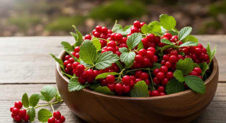 Schisandra chinensis berries in wooden bowl on rustic table
