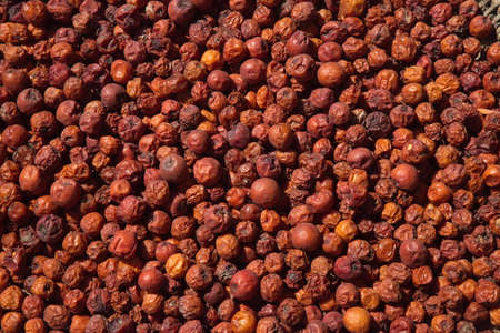 Pile of dried Berberis vulgaris, common barberry, European barberry or barberry. Edible herbal medicinal red fruit plant.