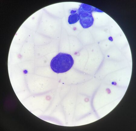 Multinucleated cell in Tzanck test finding with microscope in laboratory.