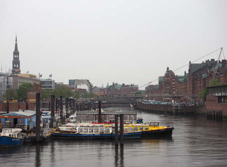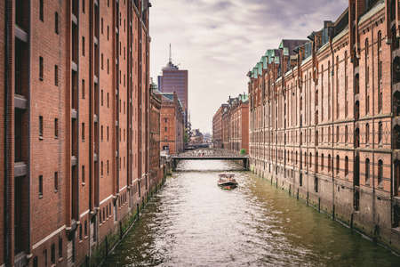 HAMBURG, GERMANY - SEP 4, 2016: Urban scene with river and old warehouse city district in hamburg, germany