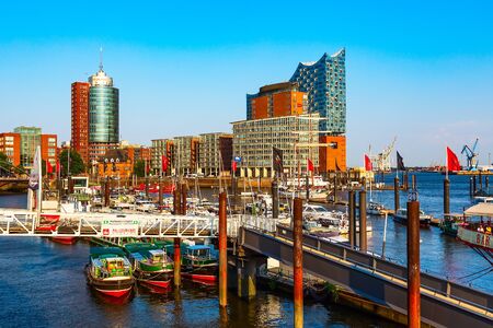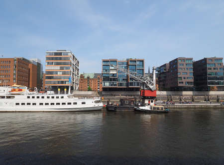 Hamburg, Germany - August 21, 2019: Modern buildings and a pier with boats, cranes and people around next to a canal in HafenCity, Hamburg, Germany