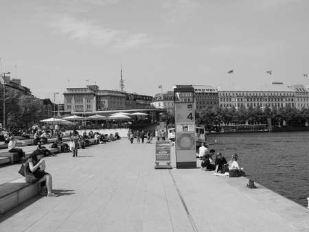 HAMBURG, GERMANY - CIRCA MAY 2017: People on Binnenalster (meaning Inner Alster lake) bank in black and white