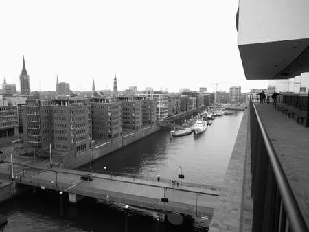 HAMBURG, GERMANY - CIRCA MAY 2017: HafenCity quarter in the district of Hamburg Mitte on the Elbe river island Grasbrook on former Hamburger Hafen (Port of Hamburg) in black and white