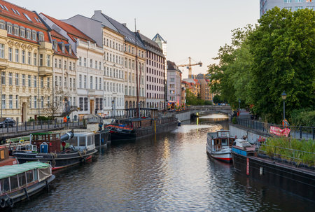 pedestrian bridge across a channel in residential neighborhood in Hamburg, Germany in warm evening sunlight
