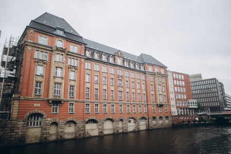 Red bricked buildings near warehouse over the dark canal water in Hafencity, Harbour district in Hamburg, Germany. Mystical gloomy atmosphere