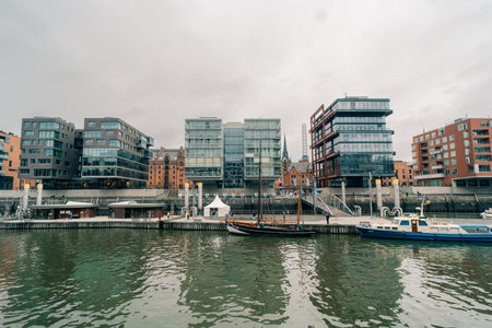 Hamburg, Germany - 1 Oct 2025 - A modern waterfront scene featuring contemporary buildings along a river, with boats docked and a cloudy sky overhead