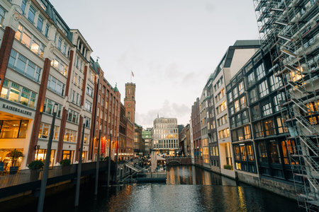 Hamburg, Germany - October 25, 2023: Modern buildings and a canal in Kehrwieder with the bell tower of Main Church of St Nikolai in the background in Hamburg.