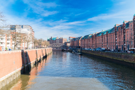 Speicherstadt warehouse district in Hamburg, Germany, Europe. Old brick buildings and channel of Hafencity quarter.