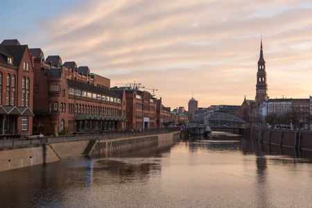 Sunset in Hamburg, German city. Historic Speicherstadt district