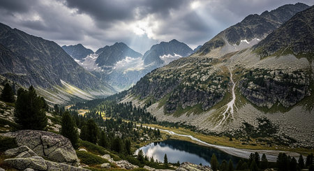 A dramatic mountain valley unfolds with a calm lake reflecting the sky. Rugged peaks rise under a stormy sky, with sunbeams piercing through the clouds.
