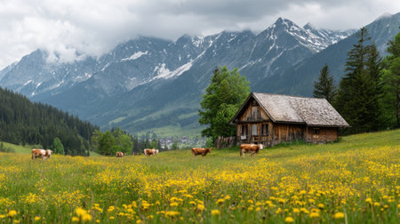 Cows are in a green field filled with flowers near a wooden cabin. Mountains rise in the background under cloudy skies.