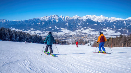 Two skiers, viewed from behind, descend a snowy slope. One wears a teal jacket, the other an orange jacket. Both have helmets and skis.
