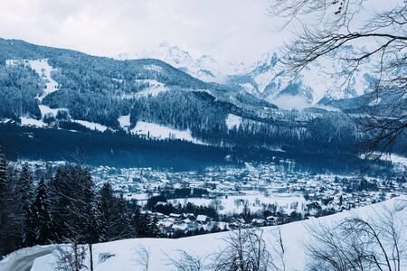 Scenery and snowy winter landscape at Bad Goisern village near Hallstatt in Upper Austria. Forest and trees with snow view. Austrian landmark.