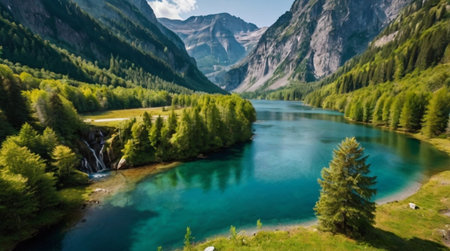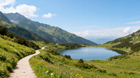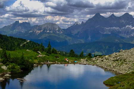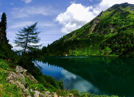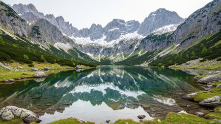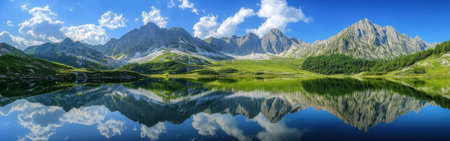 panoramic view of alpine lake with crystal clear water and reflection in water