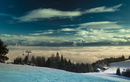 View from Dobratsch on Valley of Roses, Austria. Valley is covered with morning for, created by W�rthersee Lake. Few clouds above the Alps, visible in the back. Serene and tender morning. Soft light.