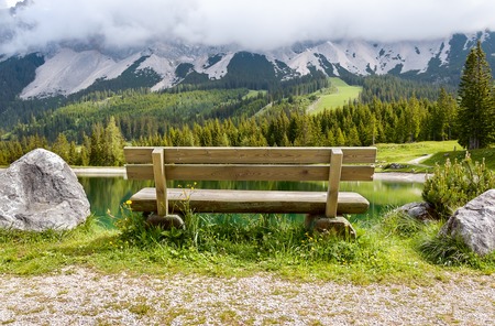 Bench near Almsee lake in the Alps mountains - Tyrol, Austria. Beautiful view on a sunny day