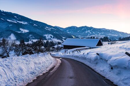 Empty road in winter Rohrmoos-Untertal, Schladming, Schladming-Dachstein, Dachstein massif, Liezen District, Styria, Austria, Europe