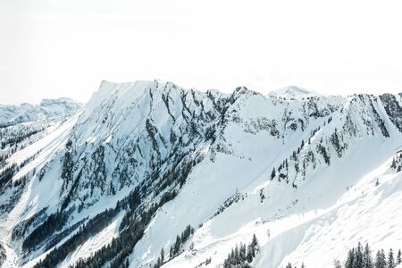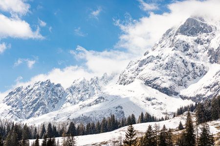 High altitude mountains peaks covered in snow in a pristine alpine landscape in winter