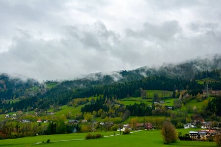 Natural rural landscape with traditional wooden houses in the valley of Enns River at the foot of Rossbrand mountain, part of the Salzburg Slate Alps, Austria