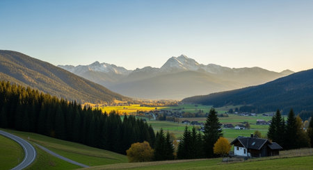 Scenic Alpine landscape with mountains, valley, houses, and road