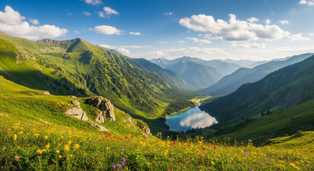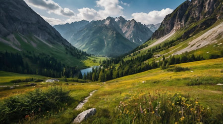 Panoramic view of beautiful alpine meadows and mountains in summer