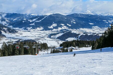 A picture from the ski resort in the austrian Alps. Snow and weather are perfect, slopes are empty. Skiing is passion in these conditions. The mountains around are great visible.